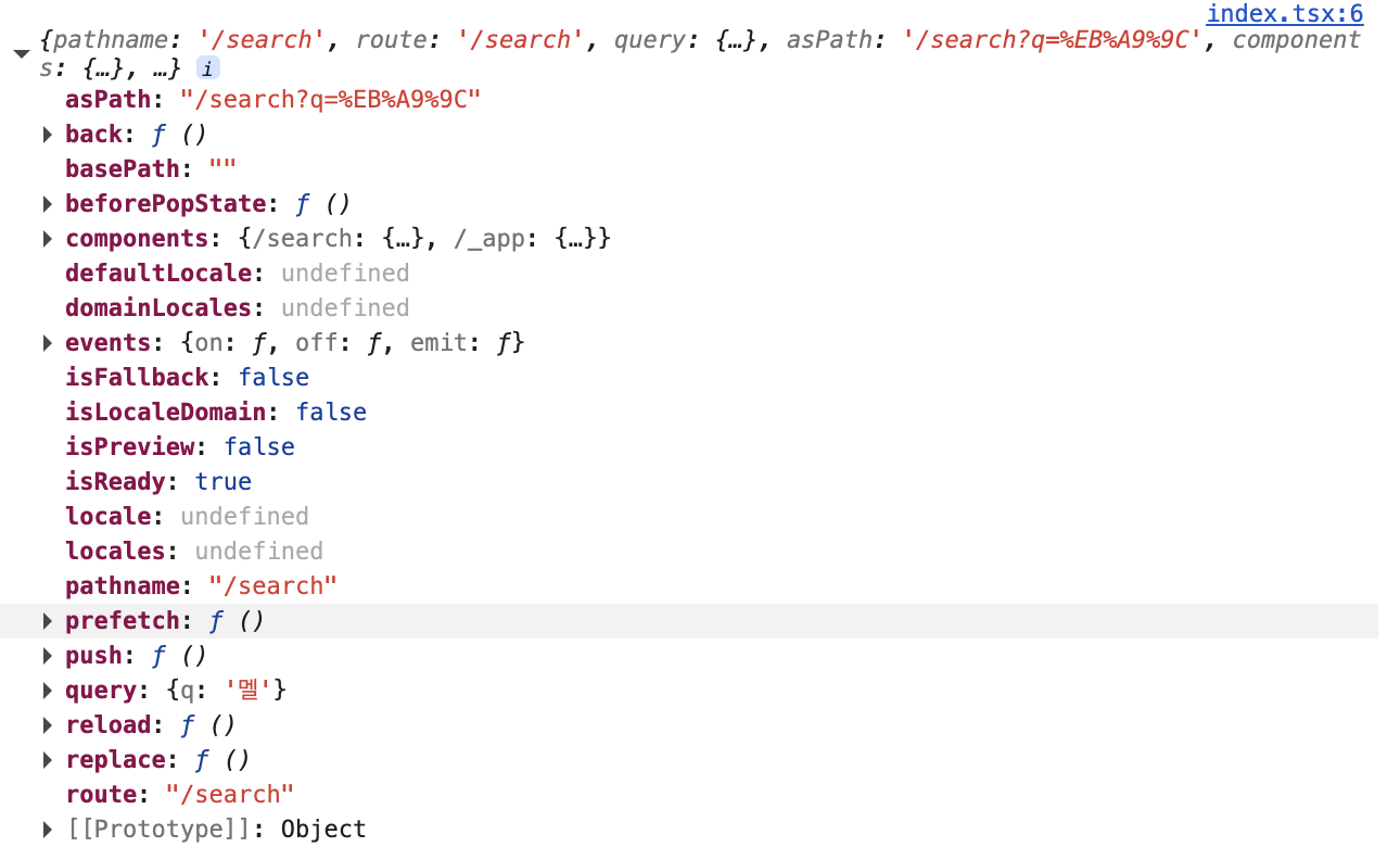 위 코드에서 '~/search?q=멜'로 주소를 쳤을 때 콘솔에 보이는 내용은 아래 이미지와 같음