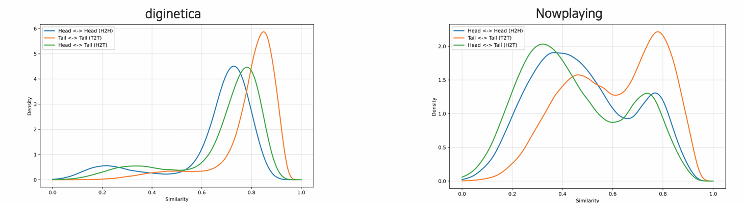 인기 아이템들 간의 유사도가 높고 비인기 아이템은 서로 다른 방향으로 다양하게 퍼져 있다.➡ 데이터셋 특성에 따라 Head/Tail 간 유사도 구조가 완전히 다르게 나타남을 보여준다.