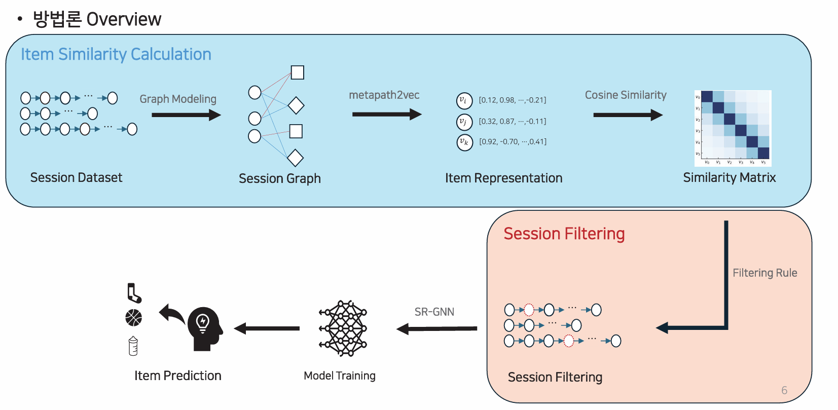 ➡ 아이템 관계를 그래프로 모델링한 후 아이템 유사도를 구하여 세션 내 인접 아이템 관계가 유의미한지 판별2. 불필요한 모델 학습시간 증가