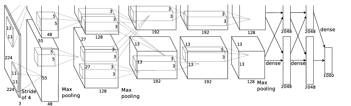 하지만 연구진은 Convolution layer만 사용하지 않고 기존의 Fully connected network 역시 사용합니다. (It contains eight learned layers — five convolutional and three fully-connected.)