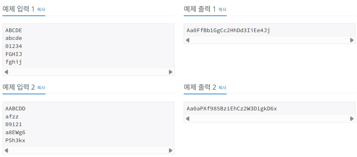 for i = 0 to 4: 각 줄의 문자 j에 대해 result[j*5+i]에 저장 result 배열을 순회하며 '\0'이 아닌 값만 출력