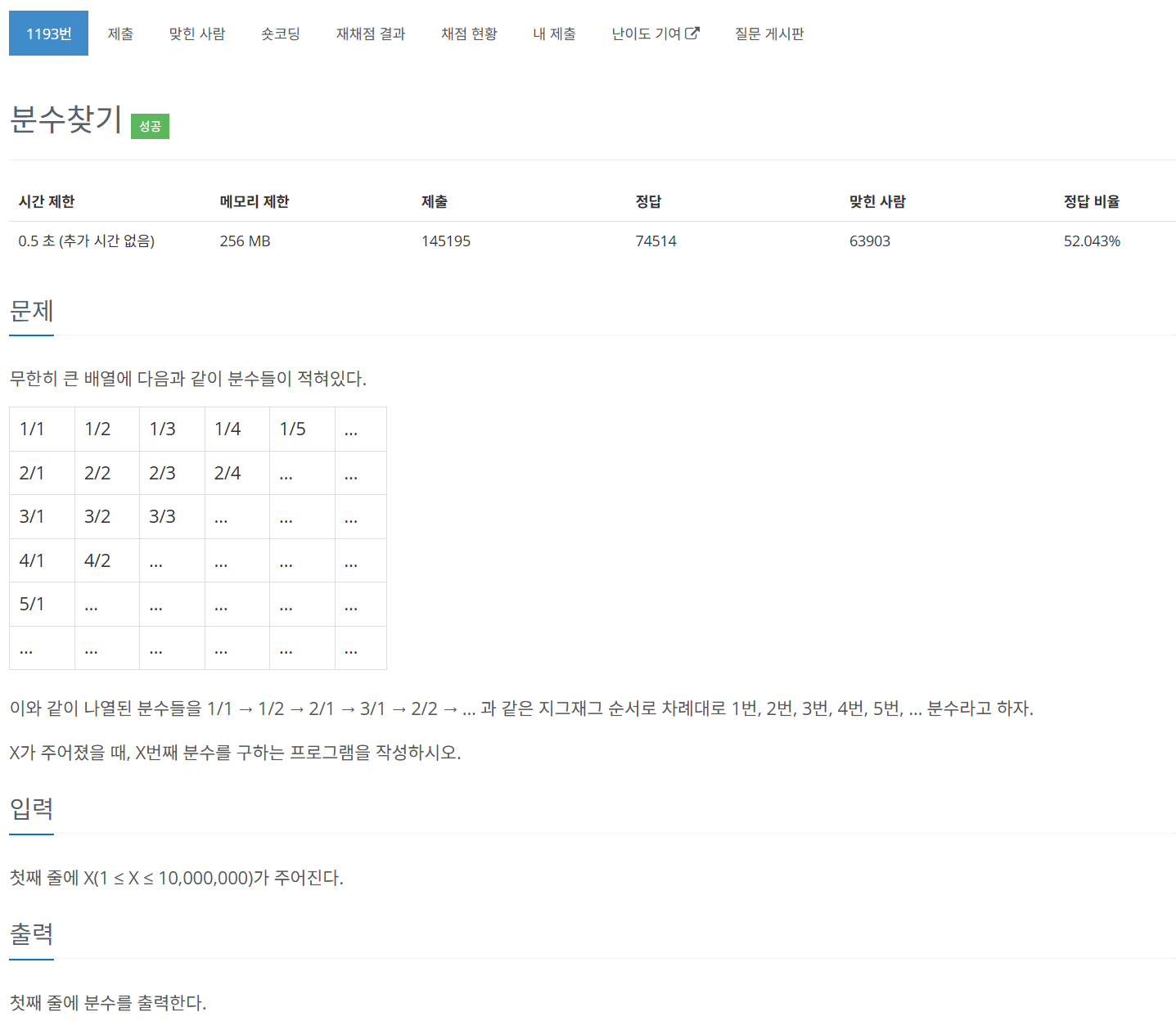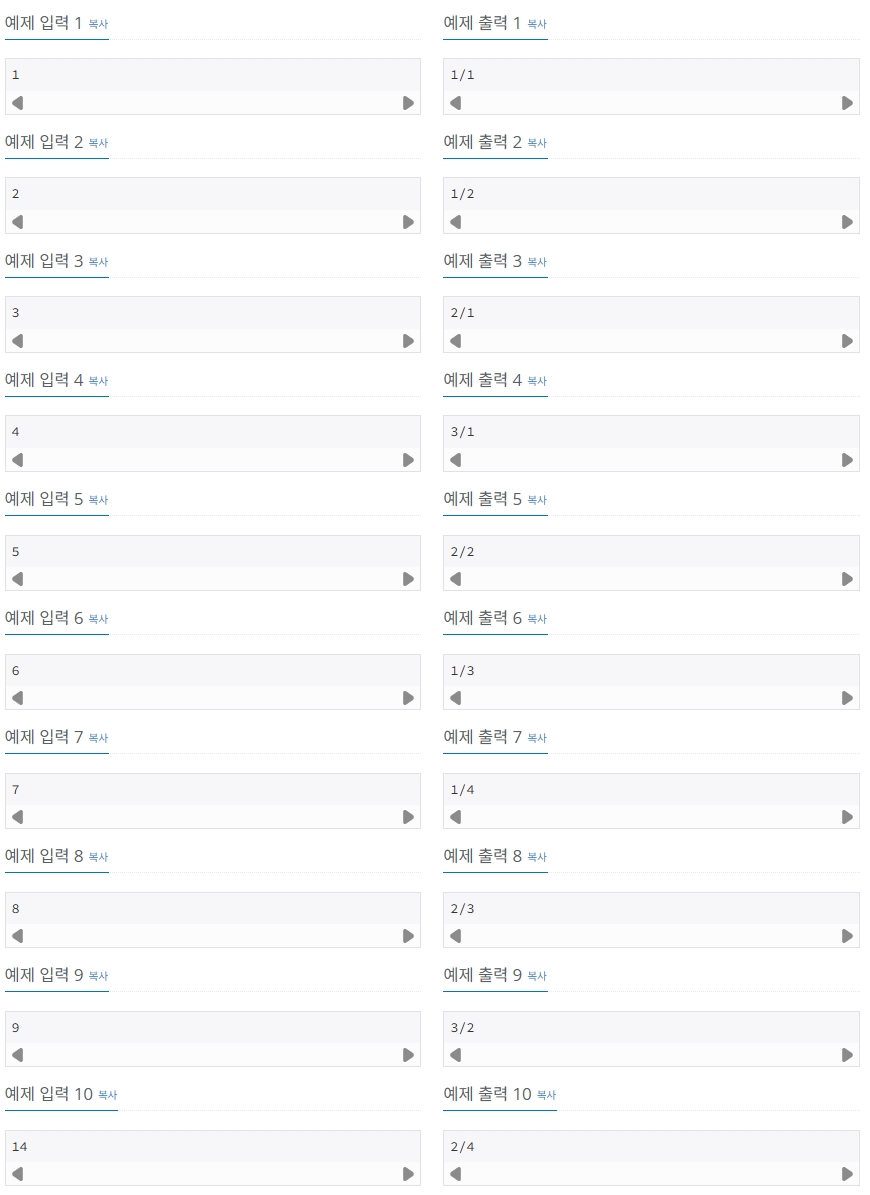 sum = 0, line = 0 while (sum < N): sum += ++line offset = N - (sum - line) if line % 2 == 0: 분자 = offset, 분모 = line - offset + 1 else: 분자 = line - offset + 1, 분모 = offset- 예외 처리
