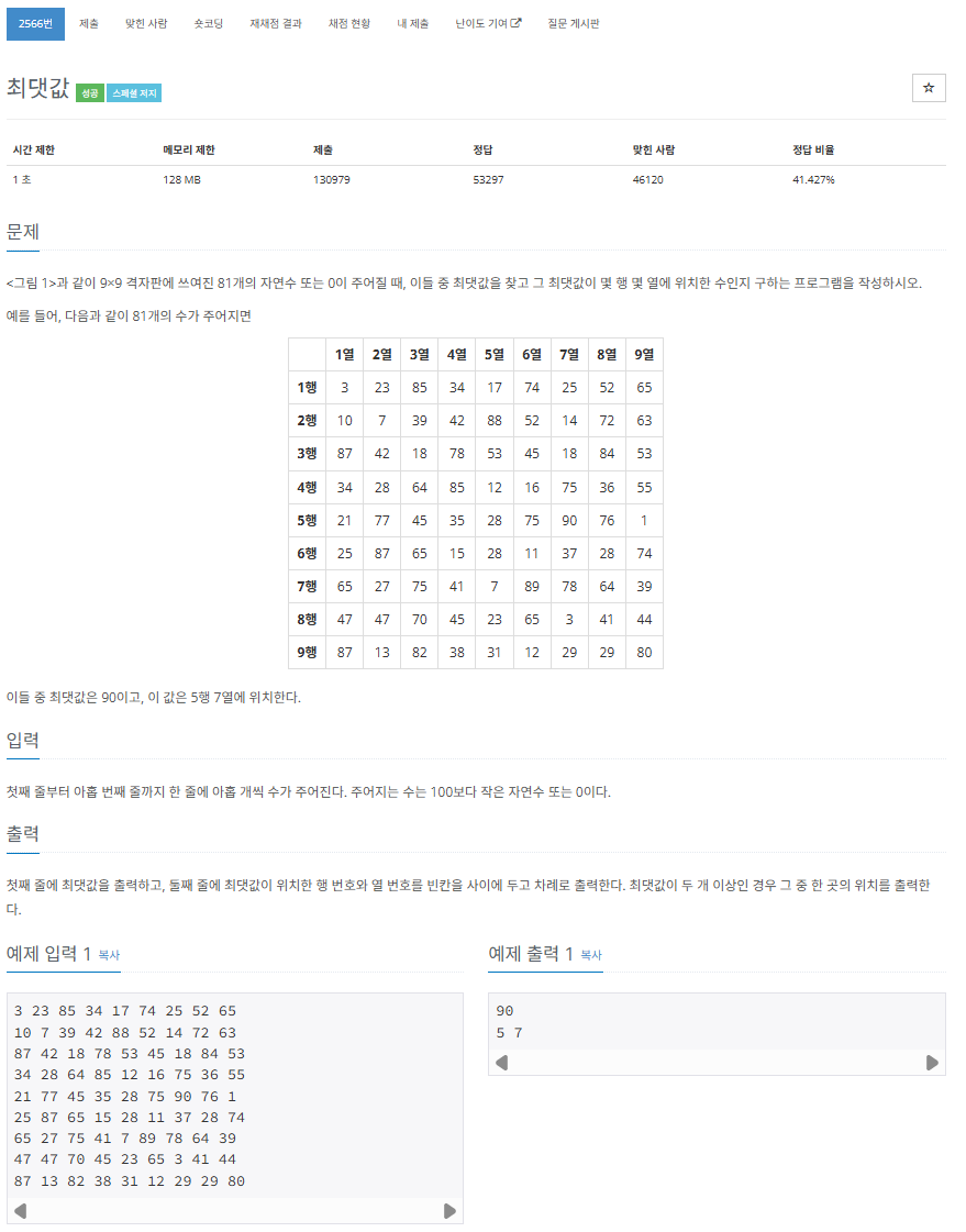 while (입력 줄 존재): for (각 숫자): if (현재 숫자 > max): max = 현재 숫자 index = [행, 열] print max, index[0]+1, index[1]+1 ``- 예외 처리
