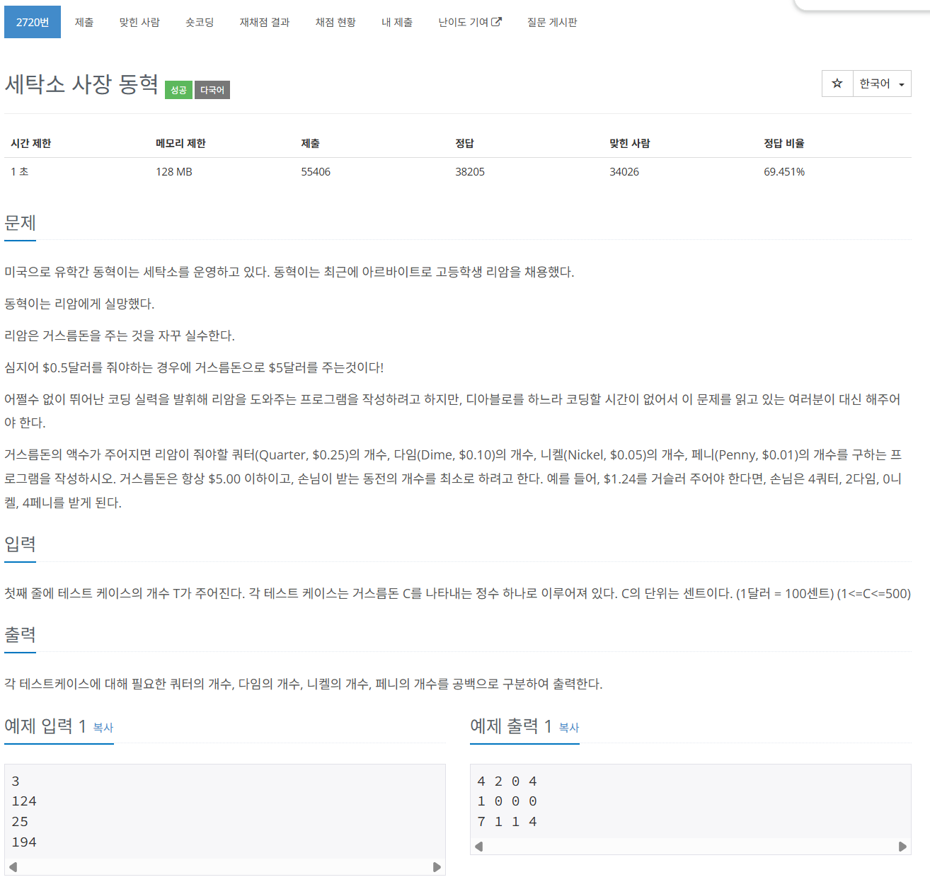 for (테스트케이스 수만큼 반복) { 쿼터 = 남은돈 / 25; 남은돈 -= 쿼터 * 25; 다임 = 남은돈 / 10; 남은돈 -= 다임 * 10; 니켈 = 남은돈 / 5; 남은돈 -= 니켈 * 5; 페니 = 남은돈 / 1; 남은돈 -= 페니; }- 예외 처리
