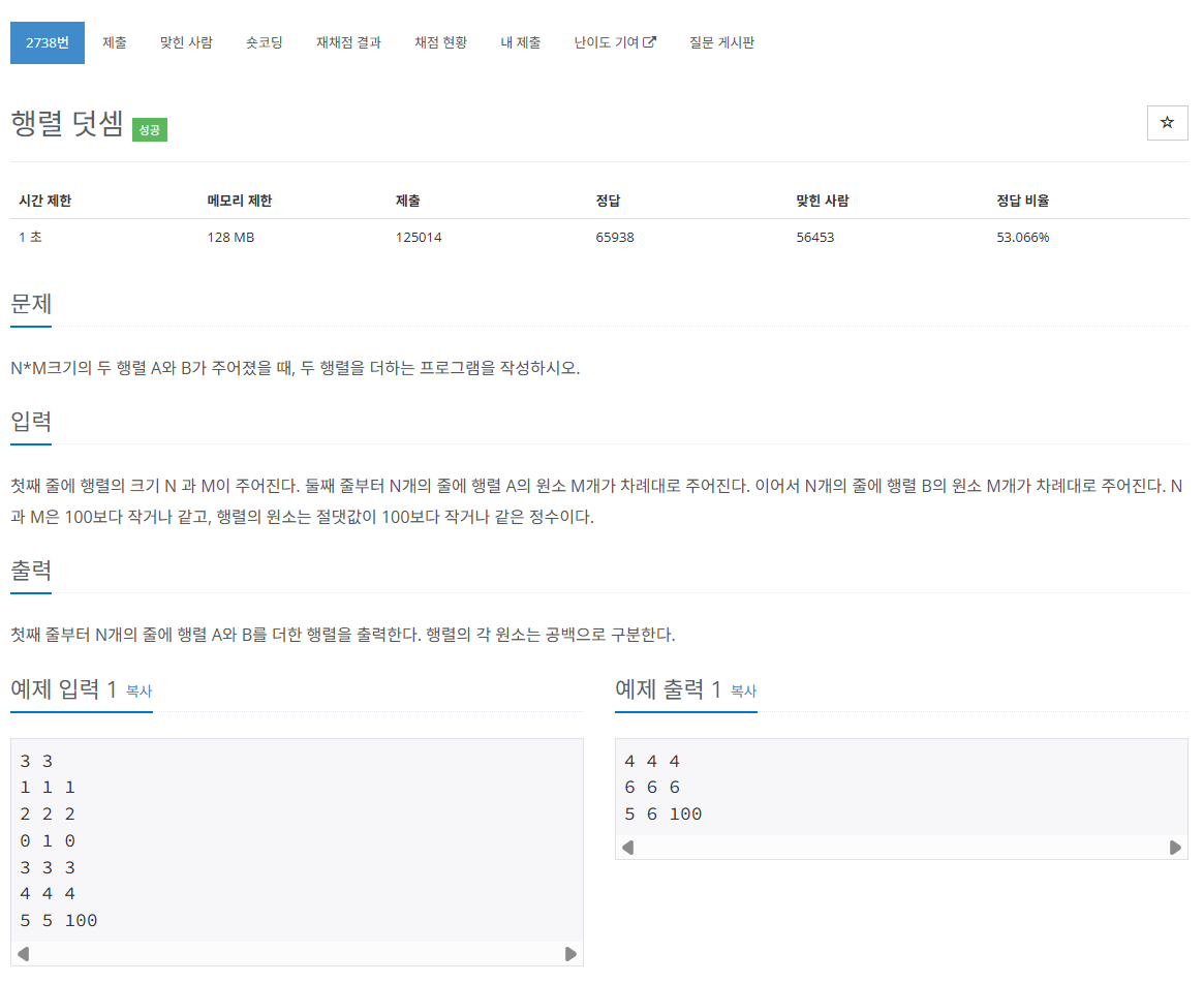 - 2N줄을 반복 입력받으며, 같은 위치의 값을 누적 덧셈 (첫 번째 행렬, 두 번째 행렬 순서로 입력)