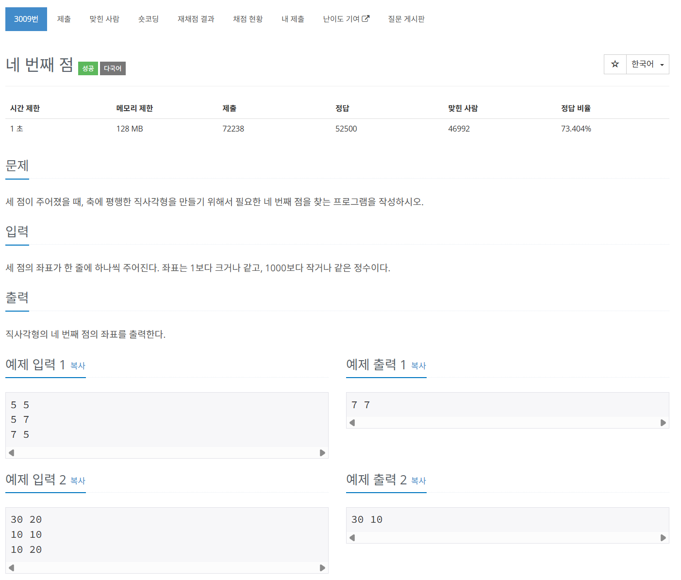 - x와 y 각각에 대해 세 점 중 유일하게 한 번만 등장한 값이 네 번째 점의 좌표이다.
