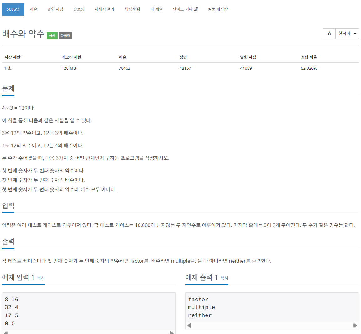 while (입력 반복) { if (a == 0 && b == 0) break; if (a % b == 0) "multiple" else if (b % a == 0) "factor" else "neither" }- 예외 처리