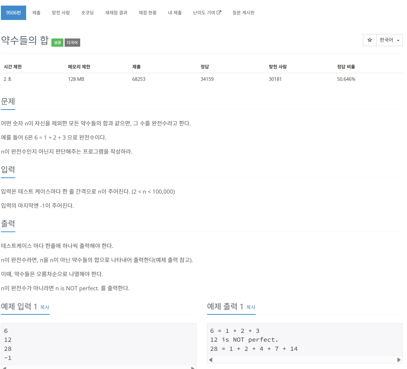 sum == n인지 확인해 완전수 여부 출력핵심 로직 흐름