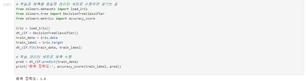 위의 예측 결과가 100프로 정확한 이유는 이미 학습한 학습 데이터 세트를 기반으로 예측했기 때문.