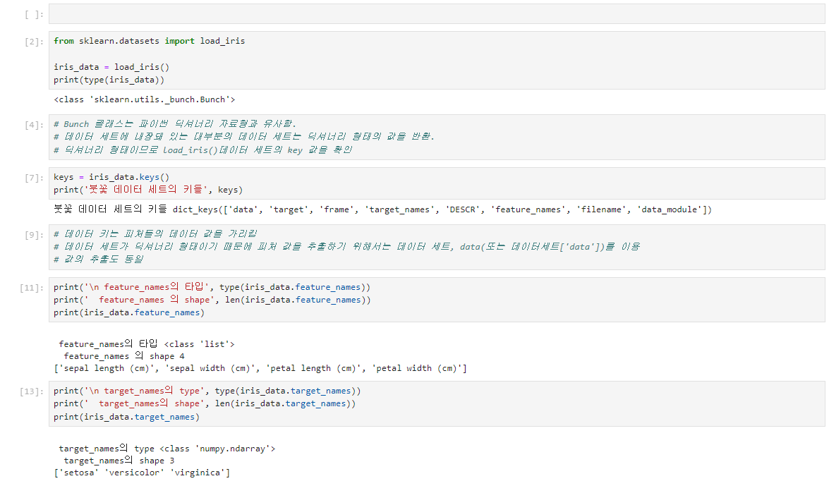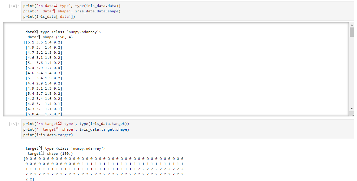 data, target은 넘파이 배열(ndarray ) 타입이며, target_names, feature_names는 넘파이 배열이나 파이썬 리스트임