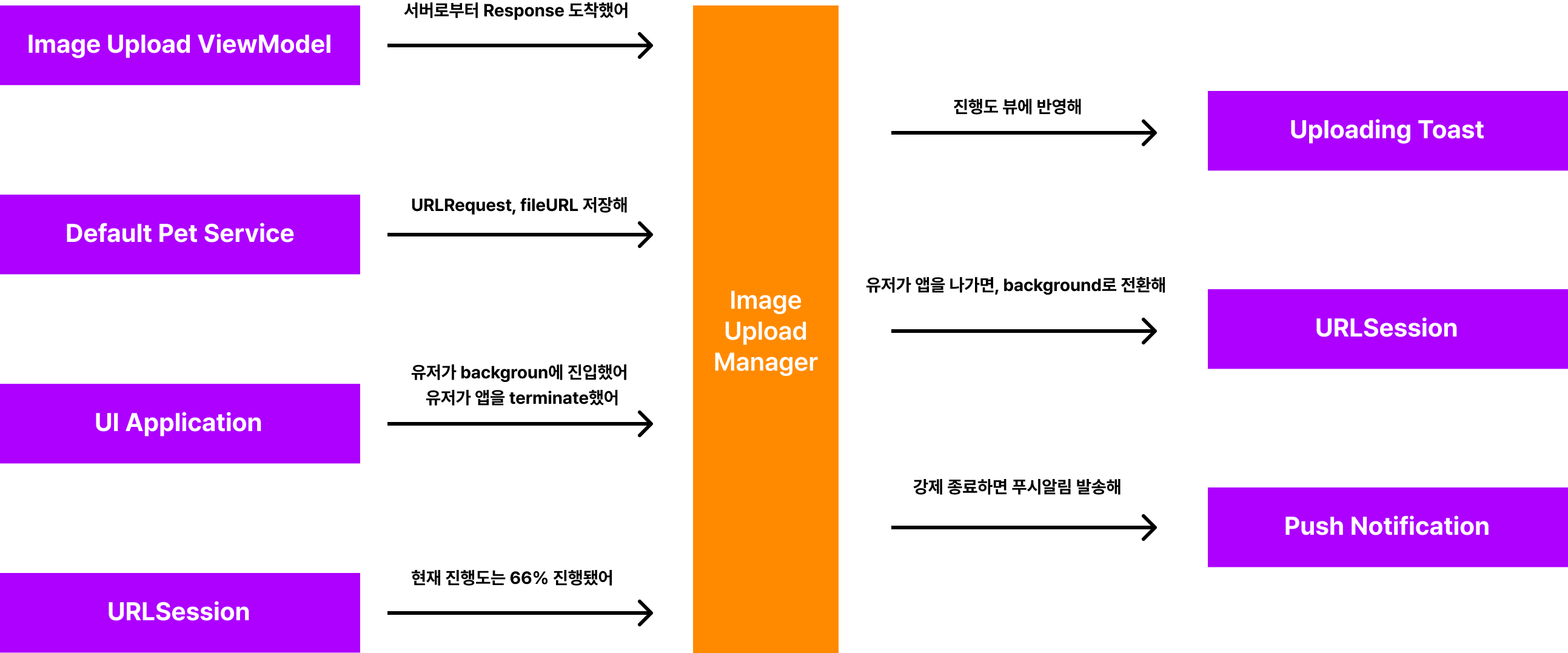 .default세션으로 통신하여 UploadingToast를 보여준다..background 세션으로 전환한다.위와 같이 앱의 생명주기에 따라 HTTP 통신 환경을 전환한다면 둘 다 챙길 수 있을 것 같습니다. 해당 아이디어를 구현하기 위해선 아래와 같은 로직을 수행해야 했어요.