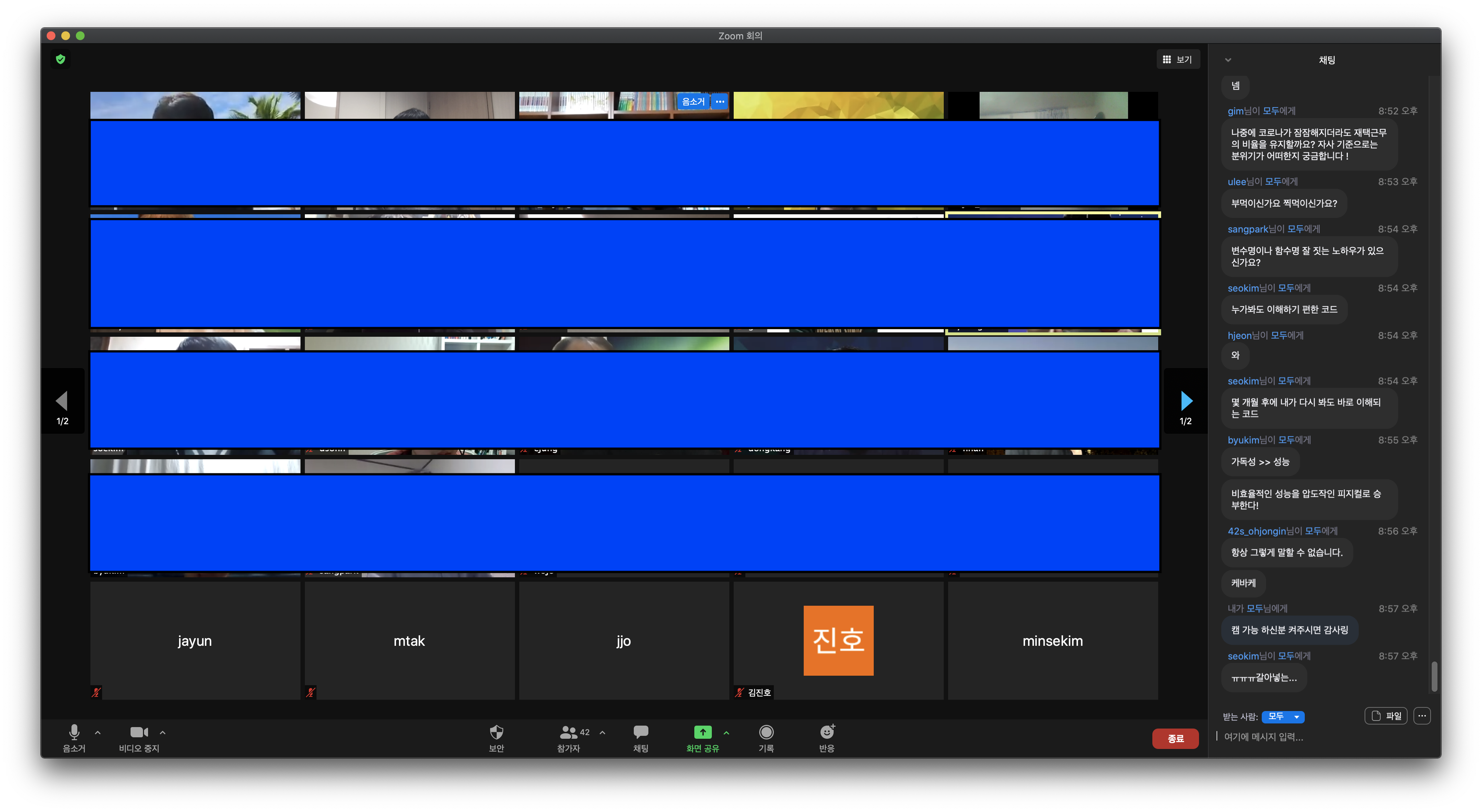 참가자 중 캠을 키고 계신 분들은 개인 정보 보호를 위해 모자이크 처리했습니다. 오늘도 오종인 멘토님께서 현업에서 업무 하시는 개발자분을 모시고 수다콘이 진행 되었습니다.