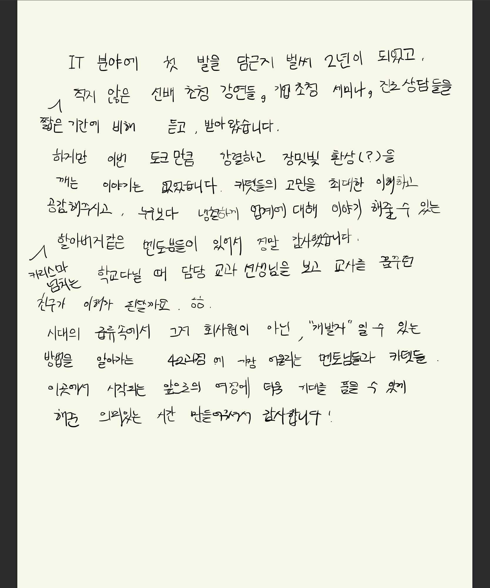 오 원래 수다콘을 처음 와봤는데, 현직자랑 대화하고 있는 것인 줄 몰랐어요 ㅋㅋㅋㅋㅋㅋ 다양한 꿀팁을 얻을 수 있도록 진행해주신 나킴님께 감사드립니다