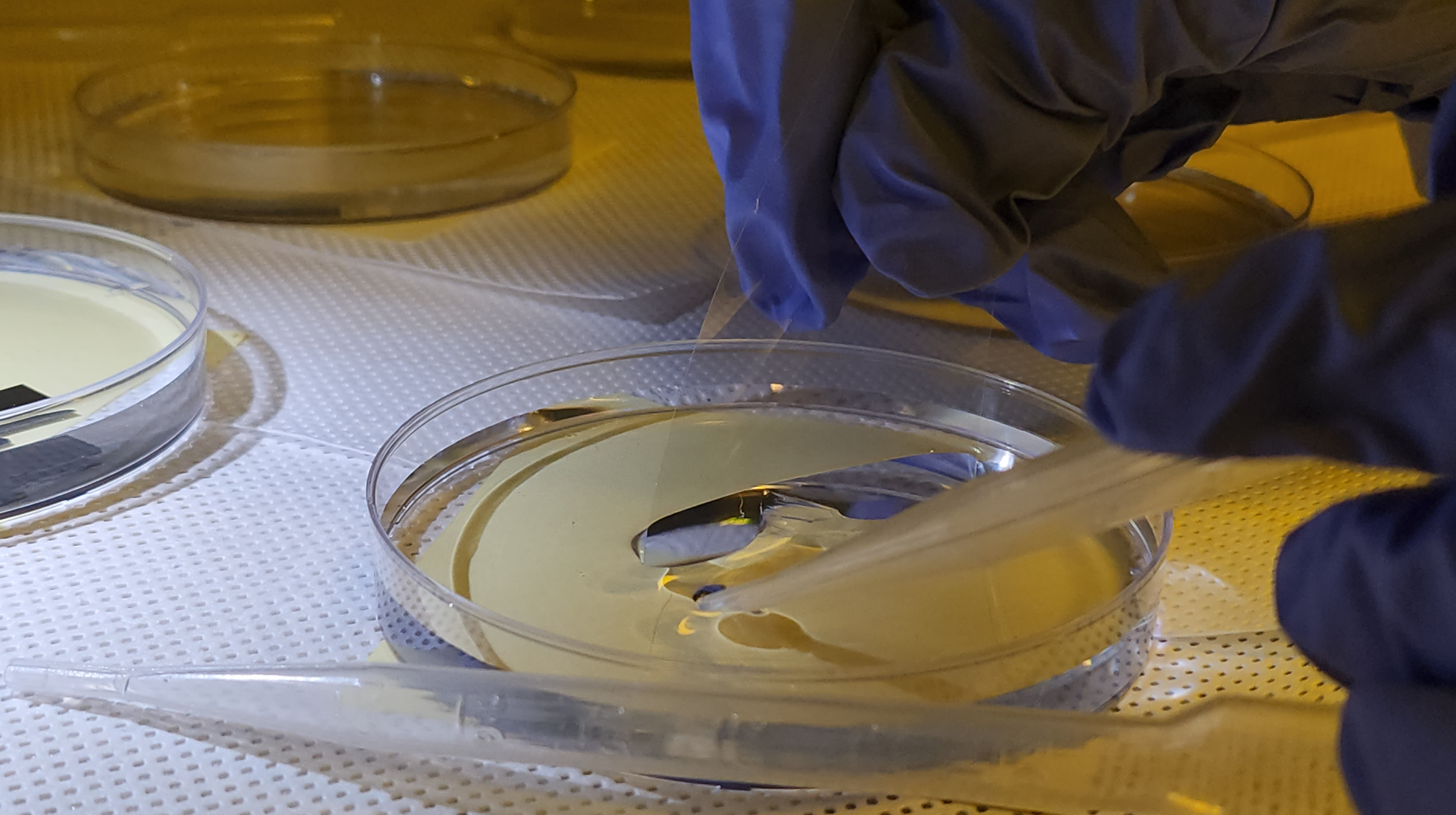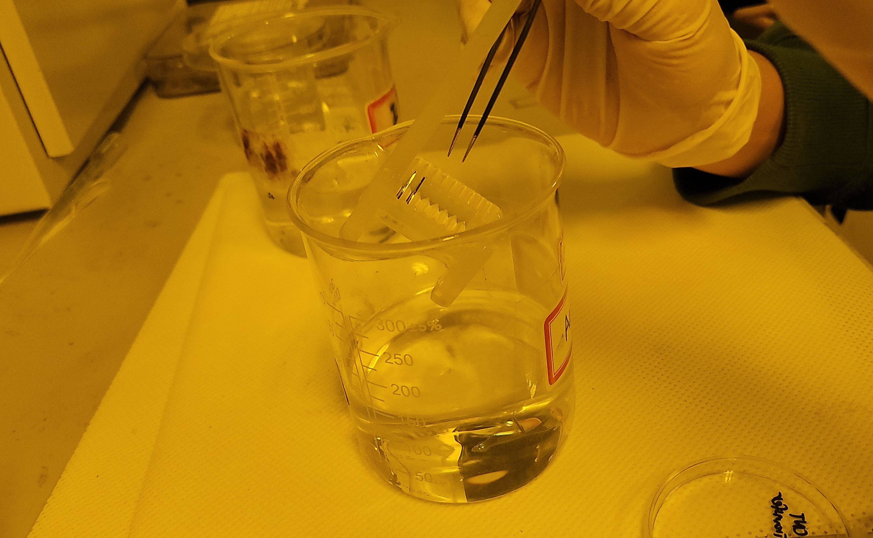 따라서 [PMMA | CNT | SiO2] 층을 긁어서 제거하여 Lift Off를 위한 HF가 침투할 수 있도록 함.