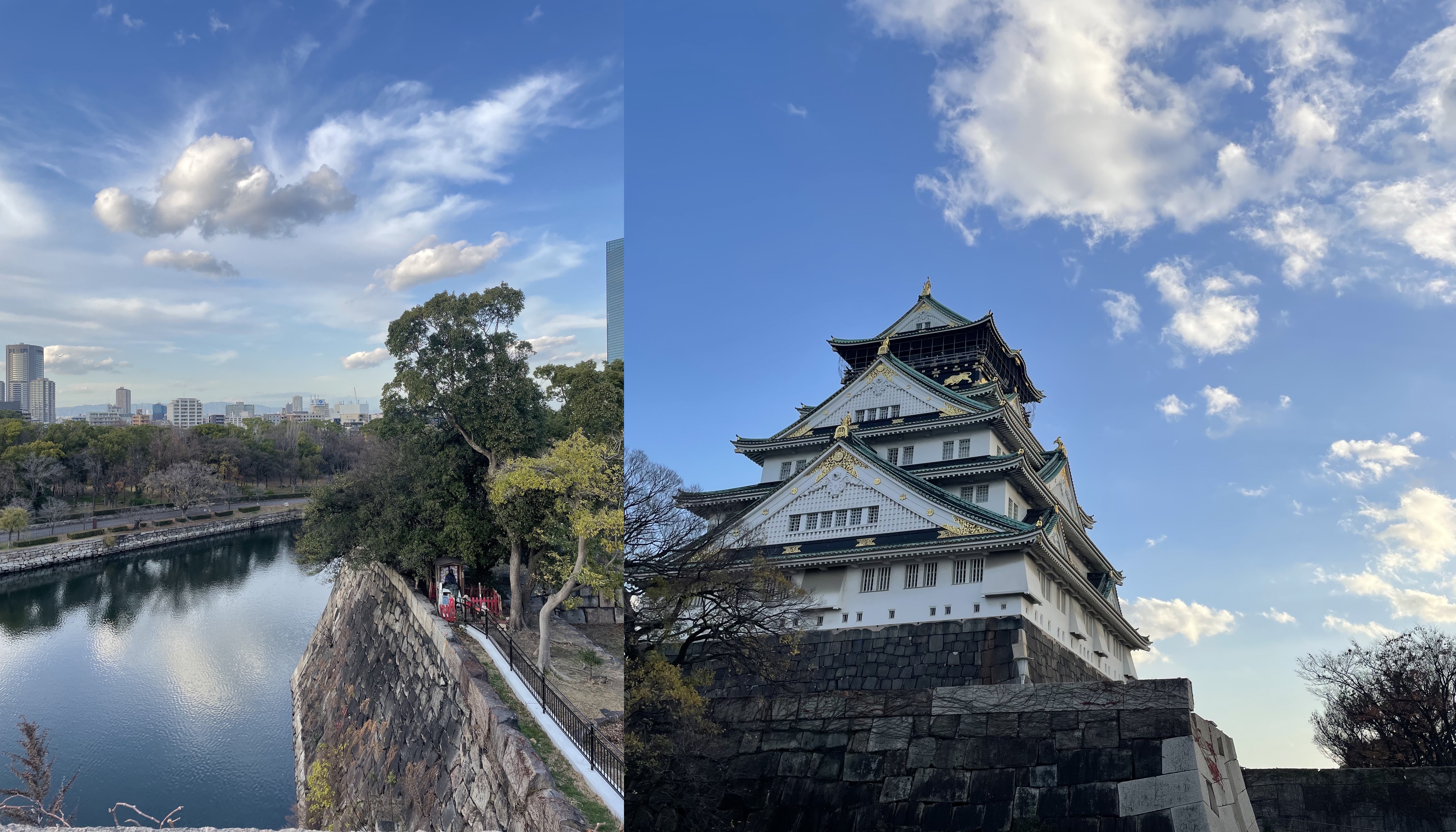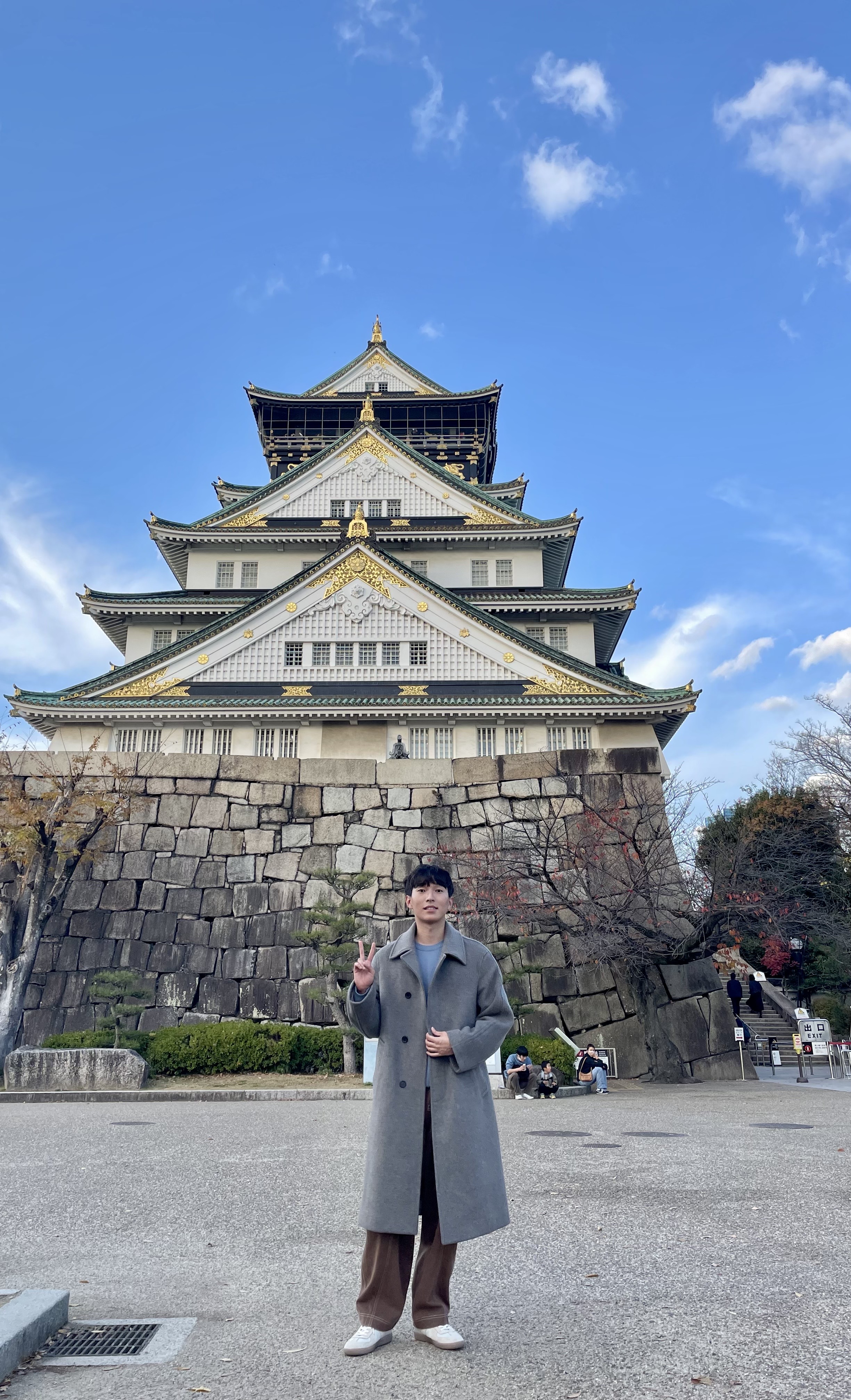 그러고 이제 오사카 성을 가려고 하는 길에, 오사카 성 주변에 배가 하나 더 도는 것을 보고 그제서야 앗차차 내가 배를 잘못 탔다라는 것을 깨달았다. 그러고 이제 오사카 성을 들어갈까 말까 고민하는데 생각해보니 올라가봤자 철근 때문에 뭐 보이지도 않고 중간중간 있는 것은 어차피 내가 읽지도 못했던 기억이 있어서 그냥 앞에서 사진만 찍고 가기로 했다. 해외에서 사진 찍는 꿀팁은 역시 한국여성분을 찾는 것이다. 당차게 한글 이름표를 달고 계신 분께 사진을 부탁드렸다. 그 분은 수줍게 "어머 저 사진 잘 못 찍는데..."로 시작하셨지만, 카메라를 들자마자 "어머 여기 너무 예뻐요. 하늘 뭐야, 너무 잘 나와요" 라는 말로 역시 내 이론은 틀리지 않았다는 걸 보여주셨다.