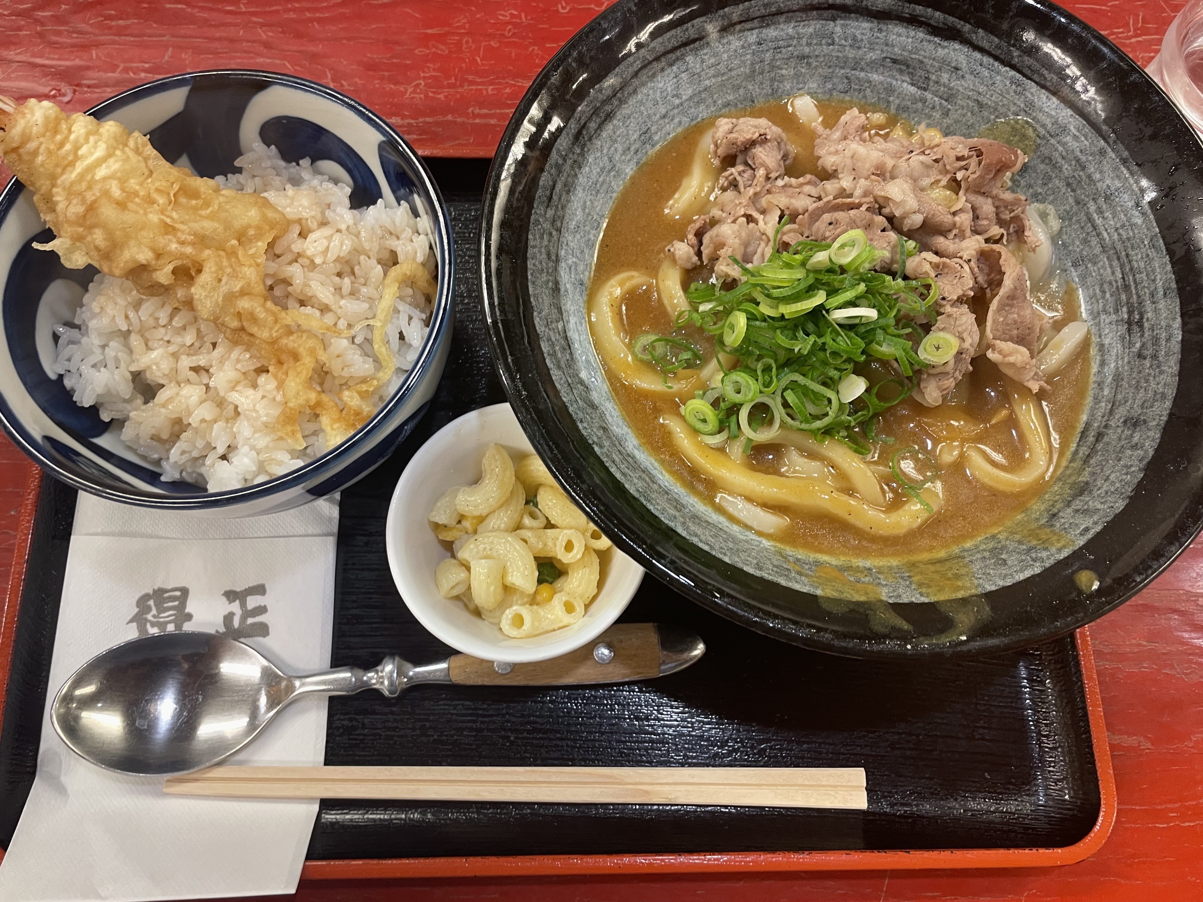 짐을 맡기고 나오니 배가 고팠다. 나름 혼자 다니다가 캐리어 사라지니 긴장도 풀리고, 우리 홍쪽이 비행기 무사히 탔다는 소식을 들으니 마음도 놓여서 그랬던 것 같다. 원래는 첫날 점심이 스시였는데 홍쪽이 버리고 혼자 스시를 먹으면 홍쪽이 비행기 놓친것도 서러운데 두배로 서러울 것 같아서 간단하게 먹으려고 했다. 다만 이 놈 도착하면 주유패스는 끝나버려서 오사카 성은 원래 계획대로 가기로 했다. 오사카 성 맛집 찾으니 카레우동 맛집이라고 '도쿠마사'라는 곳이 나왔는데 마침 오사카 여행 장인이라는 내 사촌도 여길 추천해줘서 이곳을 점심으로 정했다! 도쿠마사 니꾸우동 세트를 시켰다.