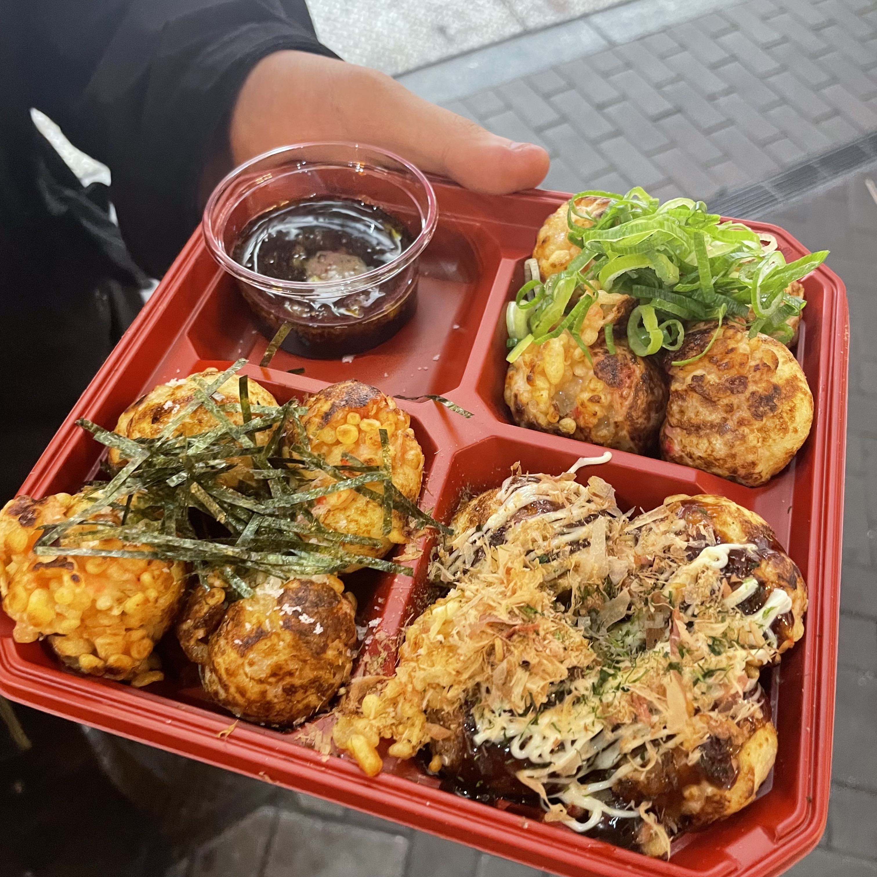 우선 몸과 마음은 물론 지갑까지 모두 굶주린 상태인 홍선이를 위해 타코야끼로 간단한 요깃거리를 했다. 그리고 이때는 몰랐다. 이 타코야끼가 일본에서 먹은 음식 중 가장 맛있는 음식이었을 줄은. 반죽이 우리나라랑 달랐고 문어만 들어간 게 아니라 새우도 들어가 있었다. 동그란 해물 완자? 느낌인데 맛은 물론이고 식감이 진짜 미쳤었다, 저 겉에 템푸라같은 거 붙은 거 봐라. 아으 이건 진짜 다시 먹고 싶네... 이건 길거리에서 먹어서 어디서 먹었는지 잘 기억은 안나는데 줄이 되게 많이 서있었다.