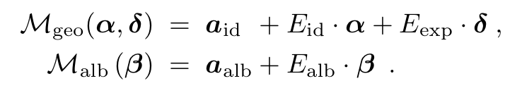 shape과 texture(reflectance)의 평균을 나타내는 와 가 존재하고 그 뒤로 shape coefficient인 reflectance coefficient인 , Expression coefficient인 가 존재하고 관련된 표준편차 역시도 각 요소마다 존재합니다. 해당 모델은 53K개의 vertices와 106K개의 얼굴을 기반으로 구성되어 있으며 이렇게 합성된 얼굴 데이터는 rigid model transformation 와 full perspective transformation 기반의 모델로 rasterization되어 Image를 형성하고, 조명은 Labertian surface와 smooth distant illumination을 가정하고 self-shadowing을 무시한 SH basis function으로 예상한다고 합니다.