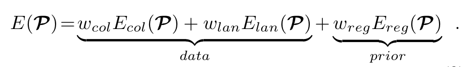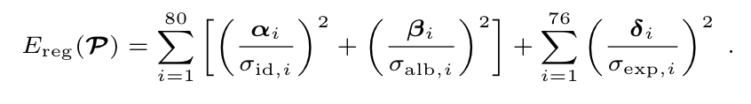 각 항에 존재하는 는 해당 파트에 대한 Energy Function으로 의 경우에는 photo-consistency를 의 경우에는 facial feature alignment를 의 경우에는 통계적 제약 요소를 의미합니다. 그리고 의 경우에는 가중치를 의미하는데 으로 설정했다고 합니다.
