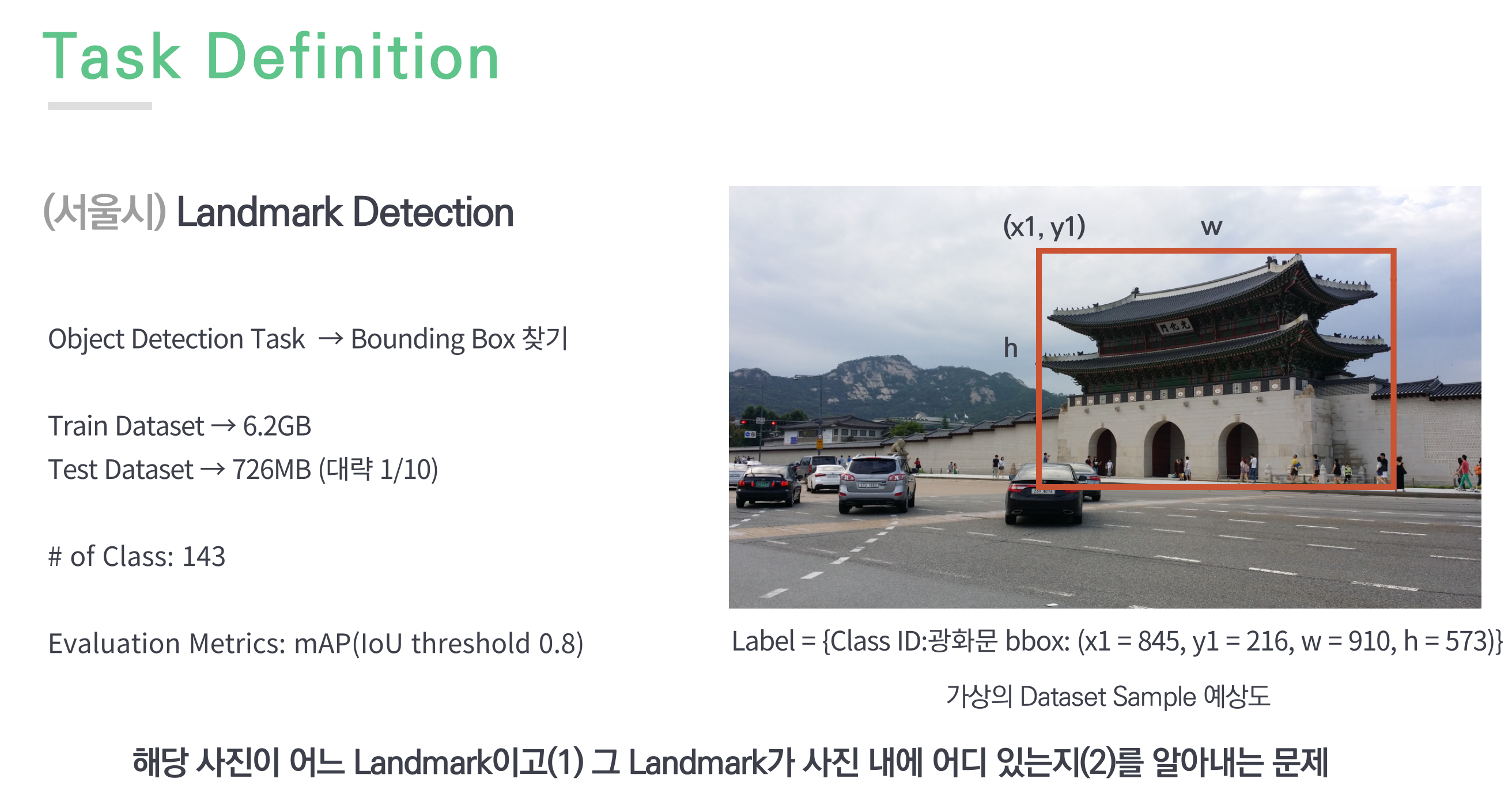 말 그대로 서울시에 있는 Landmark 사진 데이터셋에 대해 해당 사진이 어느 Landmark이고 그 Landmark가 사진 내에 어디 있는 지를 알아내는 문제였다.