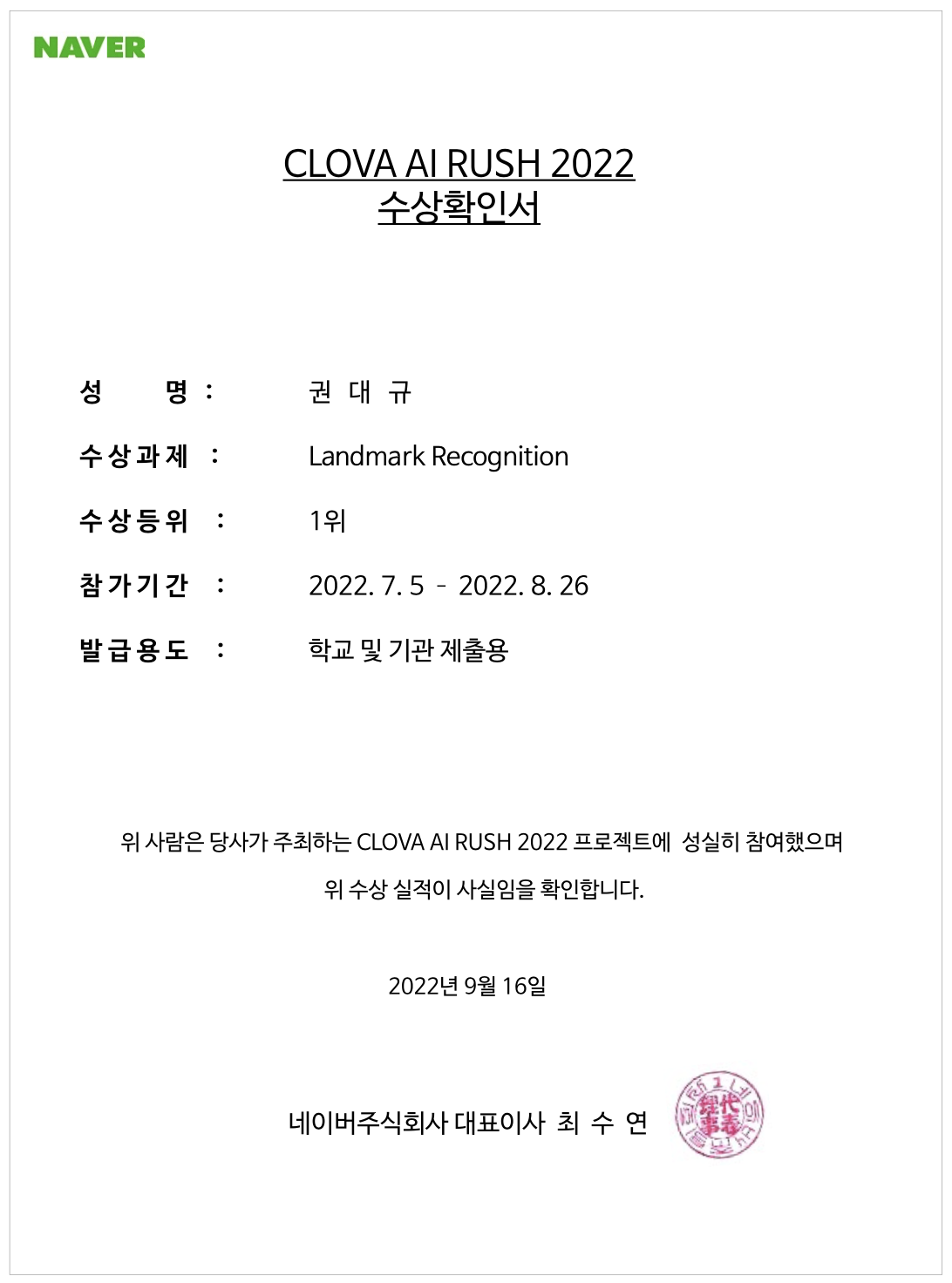 특전은 상금 1500만원 + 네이버 동계 인턴 기회 + 네이버 정규 채용 서류&코테 면제(23년까지) 정도인데 인공지능을 평생의 업으로 삼으려면 학사보다 더 높은 학위가 필요할 거라 생각해 연구의 길을 택한 나는 네이버 인턴과 채용은 사용 안할 것 같고 1500만원으로만 만족하려고 한다.
