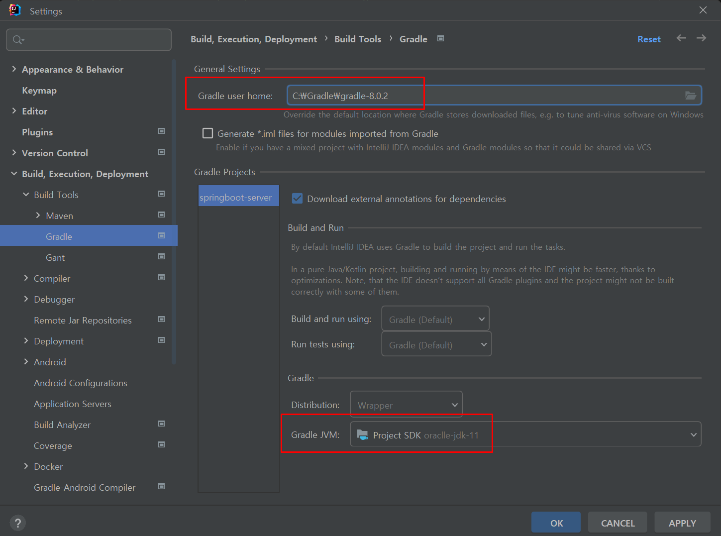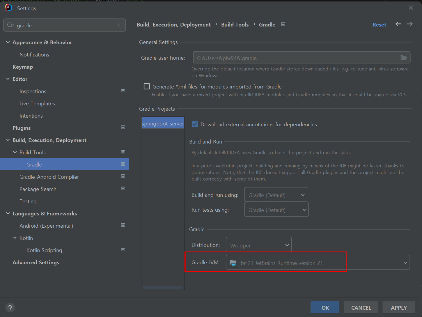 인텔리 내부적으로 사용하는 Gradle 버전이 내가 설치한 Gradle 버전과 다르다.