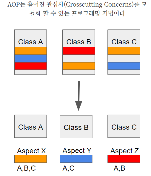 핵심기능과 부가기능으로 구분해 각각을 하나의 관점으로 보는것을 의미한다. (모듈화 하는 것)모듈화: 어떤 공통된 로직이나 기능을 하나의 단위로 묶은 것