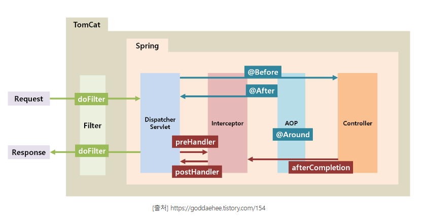 Interceptor와 Filter는 Servlet 단위에서 실행된다. 반면에 AOP는 메소드 앞에 Proxy패턴의 형태로 실행된다.