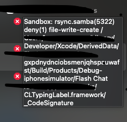 이 에러는 rsync이라는 프로세스가 특정 경로인 "/Users/.../Build/Debug-"에 대한 파일 쓰기 및 생성 권한을 거부받았음을 나타냅니다.