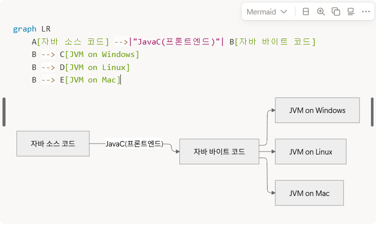 - JVM์ ์ด ๋ฌธ์ ๋ฅผ ๊ทผ๋ณธ์ ์ผ๋ก ํด๊ฒฐํ๋๋ฐ, ์๋ฐ ์์ค ์ฝ๋๋ฅผ ์๋ฐ ์ปดํ์ผ๋ฌ(javac)๊ฐ ์๋ฐ ๋ฐ์ดํธ ์ฝ๋(Byte Code)๋ผ๋ ์ค๊ฐ ์ธ์ด๋ก ๋ฐ๊พธ๊ธฐ ๋๋ฌธ์