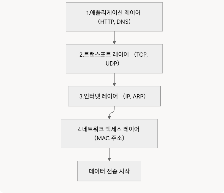 - ๊ณ์ธต๋ณ ํ์ธ: ์ธํฐ๋ท ๋ ์ด์ด์ IP ์ฃผ์์ ๋คํธ์ํฌ ์ก์ธ์ค ๋ ์ด์ด์ ๋งฅ ์ฃผ์๋ฅผ ์ฌ์ฉํด์ ์ฌ๋ฐ๋ฅธ ๋ชฉ์ ์ง์ ๋์ฐฉํ์ผ๋ฏ๋ก, ํธ๋์คํฌํธ ๋ ์ด์ด๋ถํฐ ์ฒ๋ฆฌ๊ฐ ์งํ๋๋ค.