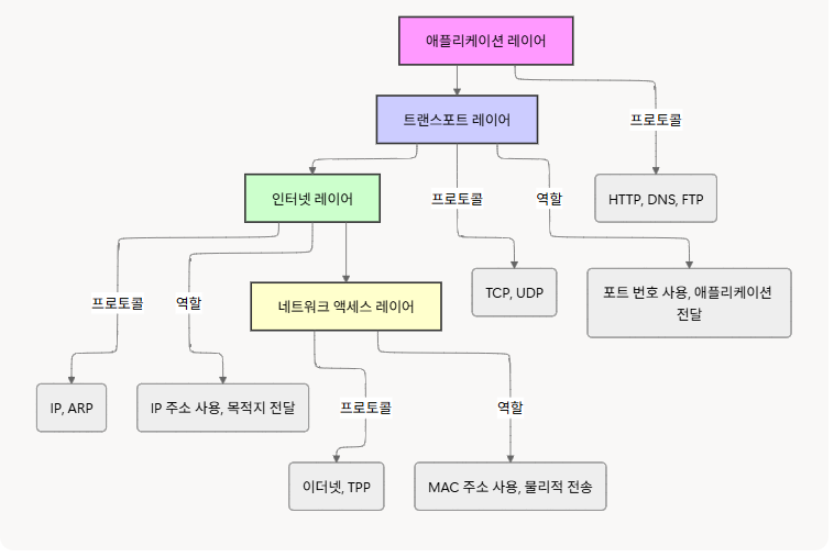 ๋ ์ด์ด, ํธ๋์คํฌํธ ๋ ์ด์ด, ์ธํฐ๋ท ๋ ์ด์ด, ๋คํธ์ํฌ ์ก์ธ์ค ๋ ์ด์ด์ 4๊ณ์ธต์ผ๋ก ๊ตฌ์ฑ๋์ด ์๋ค.