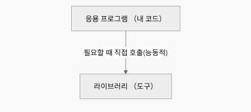 | ๋ผ์ด๋ธ๋ฌ๋ฆฌ | ์์ฉ ํ๋ก๊ทธ๋จ์ด ํ์ํ ๋ ๋ฅ๋์ ์ผ๋ก ํธ์ถ | ๋ด๊ฐ ๋ถ๋ฅด๋ ์ ๋ฌธ ๋๊ตฌ(Tool) | ๊ตฌํ ๋ก์ง ํฌํจ (ํจ์ ์งํฉ) |