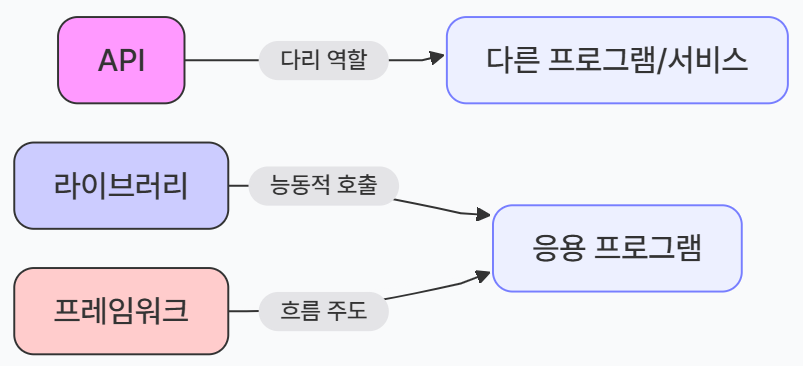 ๐ API, ๋ผ์ด๋ธ๋ฌ๋ฆฌ, ํ๋ ์์ํฌ๋ ๊ฐ๊ฐ ๋ฌด์์ด๋ฉฐ, ๊ทธ ์ฐจ์ด์ ์ ๋ฌด์์ธ๊ฐ์?