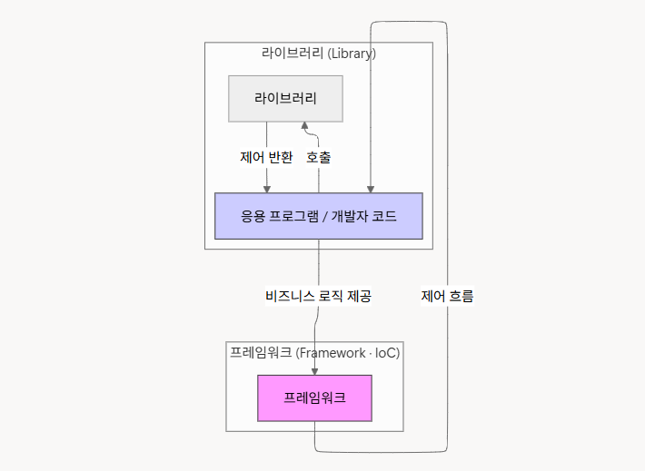 - ๋ผ์ด๋ธ๋ฌ๋ฆฌ์ ํ๋ ์์ํฌ ์ฐจ์ด์ : ์์ฉ ํ๋ก๊ทธ๋จ์ ํ๋ฆ ์ฃผ๋๊ถ์ ํ๋ ์์ํฌ๊ฐ ๊ฐ์ง๊ณ ์๋๋, ์๋๋ฉด ์์ฉ ํ๋ก๊ทธ๋จ์ด ๊ฐ์ง๊ณ ์๋๋์ ์ฐจ์ด์ด๋ค.
