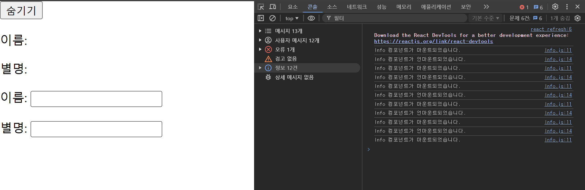 -Info 컴포넌트 숨기기:버튼을 눌러 Info 컴포넌트를 숨기면 "언마운트되었습니다." 메시지가 콘솔에 출력.