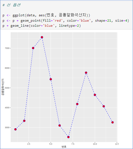 p <- ggplot(data, aes(x = 번호, y = 공룡알화석산지))