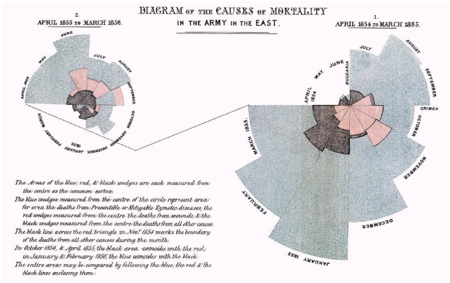 The legend reads: The Areas of the blue, red, & black wedges are each measured from the centre as the common vertex. The blue wedges measured from the centre of the circle represent area for area the deaths from Preventable or Mitigable Zymotic diseases, the red wedges measured from the centre the deaths from wounds, & the black wedges measured from the centre the deaths from all other causes. The black line across the red triangle in Nov.