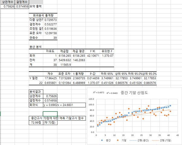 R 제곱 = 0.75826^2 = 0.5749 (약 0.5750 또는 57.50%)입니다.- 회귀식: y = 0.6902x + 24.6831 (y: 기말고사 점수, x: 중간고사 점수)