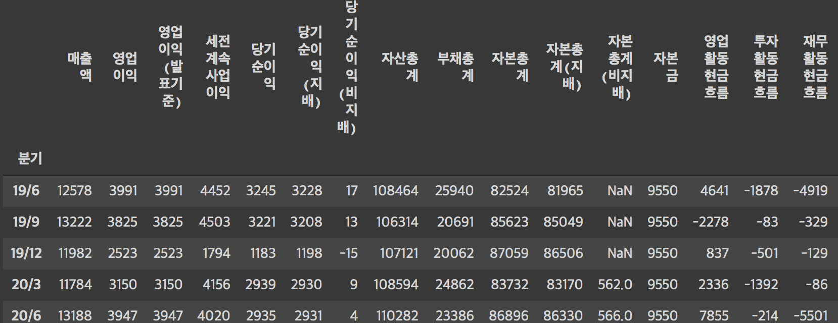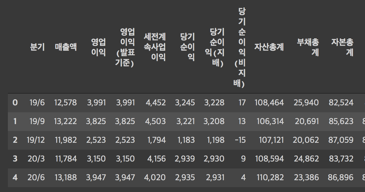 에러가 뜬다. $쓰지도 않았는데 keyerror 뜸. 이게 숫자로 안 읽히고 스트링으로 읽혀서 그렇단다.(아래 이미지의 자본총계(비지배)부분 보면 NaN이 보이죵?) 여기서 형변환을 해줘야 하나봄