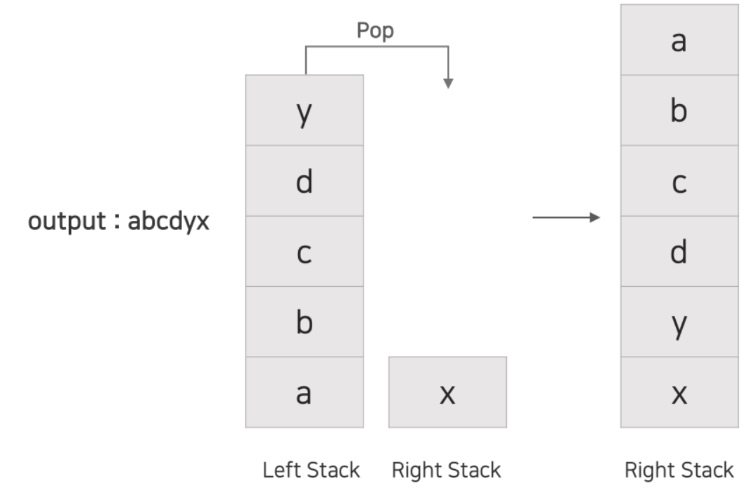 그리고 커서가 오른쪽으로 이동하면 오른쪽 스택의 가장 상단 요소를 왼쪽 스택에 pop() 시켜주며 마치 커서가 이동하는 것처럼 구현한다.