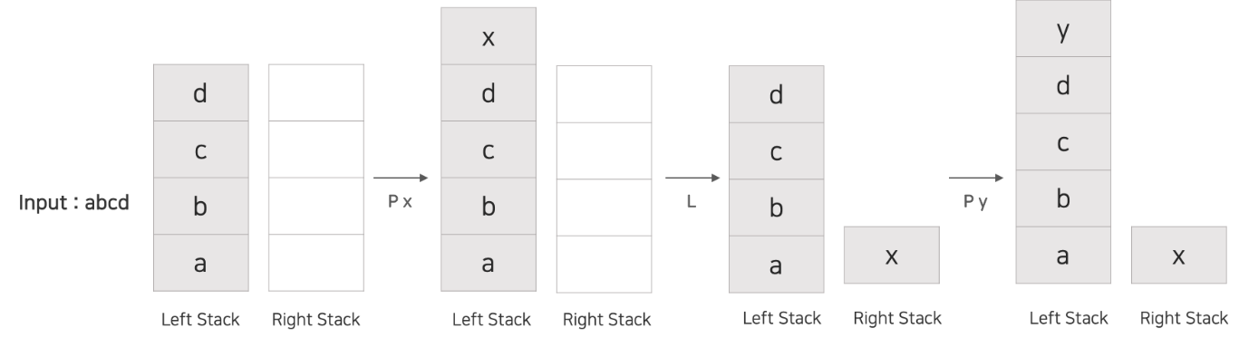 맨 처음 커서는 입력 문자열의 맨 뒤에 위치하기 때문에 문자열을 모두 왼쪽 스택에 넣어준다.