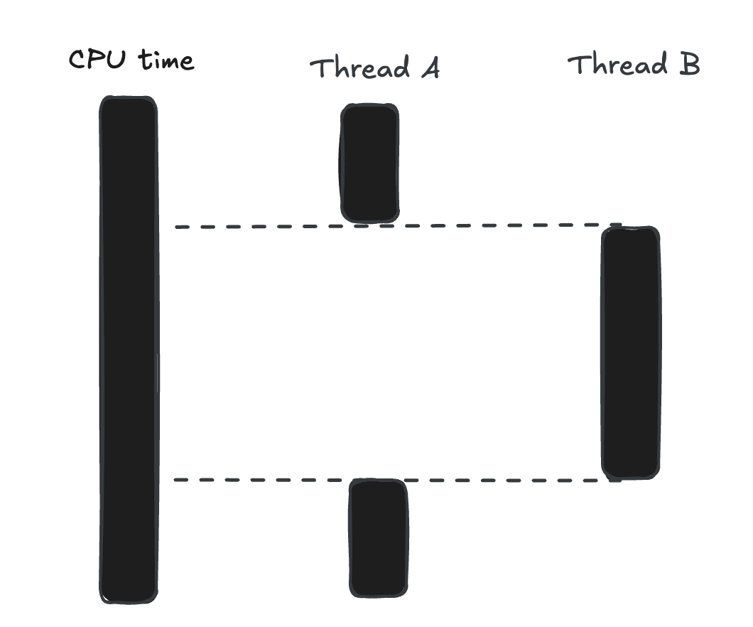 Most blocking is related to I/O because CPU processing is much faster than that of other devices, such as disks, keyboards, and networks. Therefore, when a program, thread, or process encounters an I/O task, it yields CPU time back to the operating system, which then assigns it to a different thread, as follows: