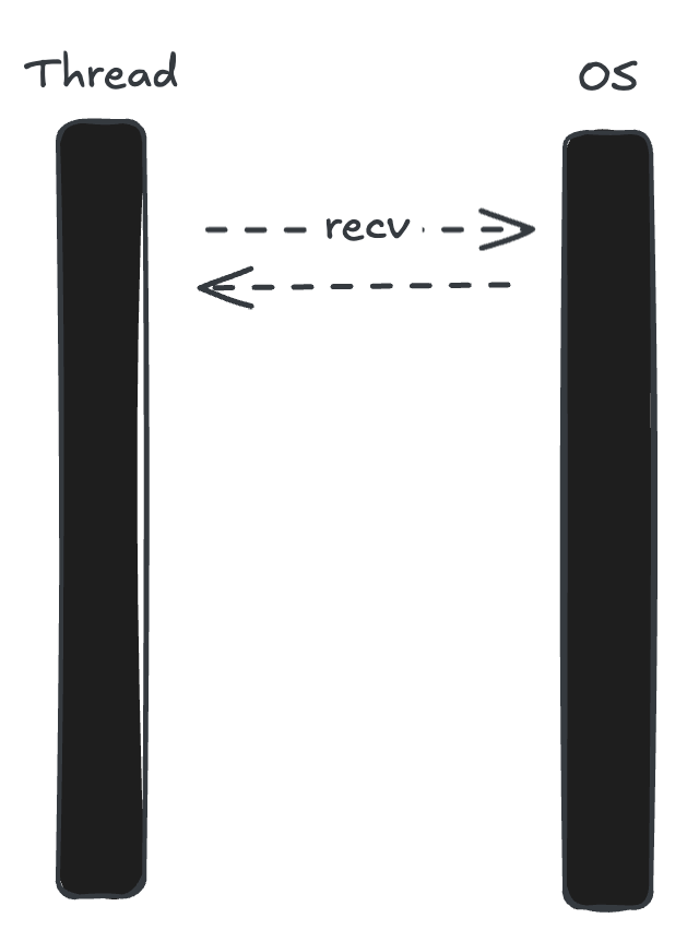 Take network data transfer as an example. If the data receiving function recv is non-blocking, it means that instead of yielding control, the OS returns from recv immediately. The invoking thread continues its work, while data reception is handled by the kernel:
