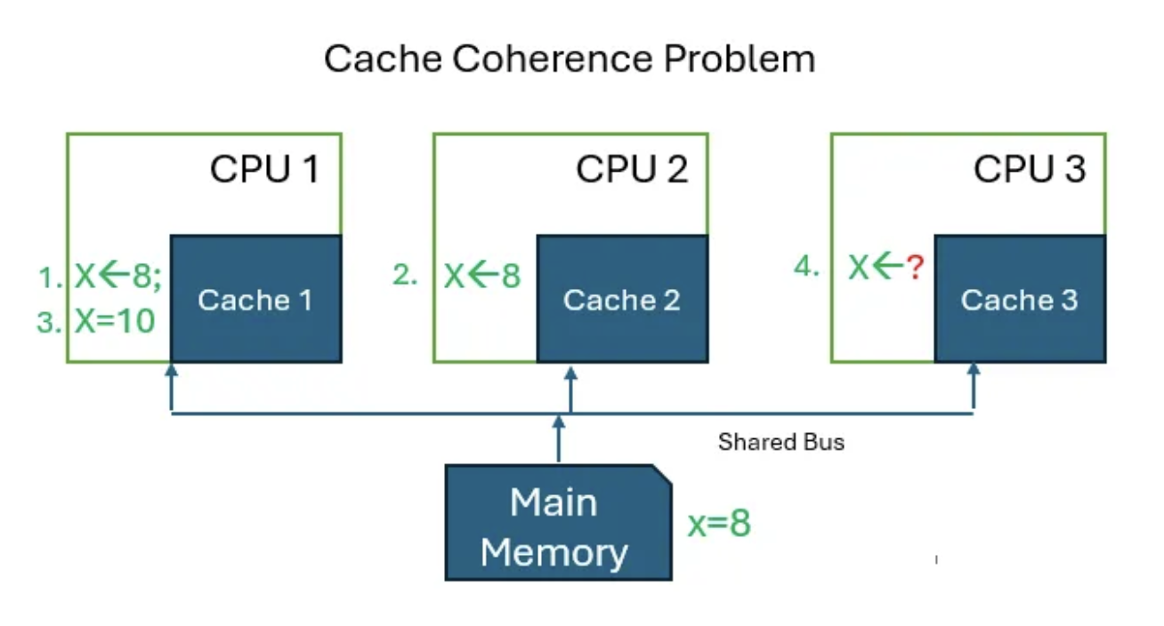 The problem happens when we write something. CPUs do not write things directly interact with memory. So for the fleeting moment, data on memory becomes stale - inconsistency issue.