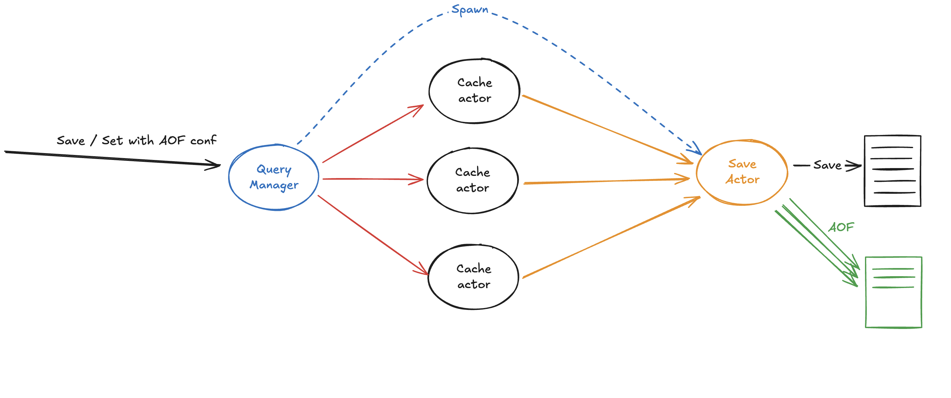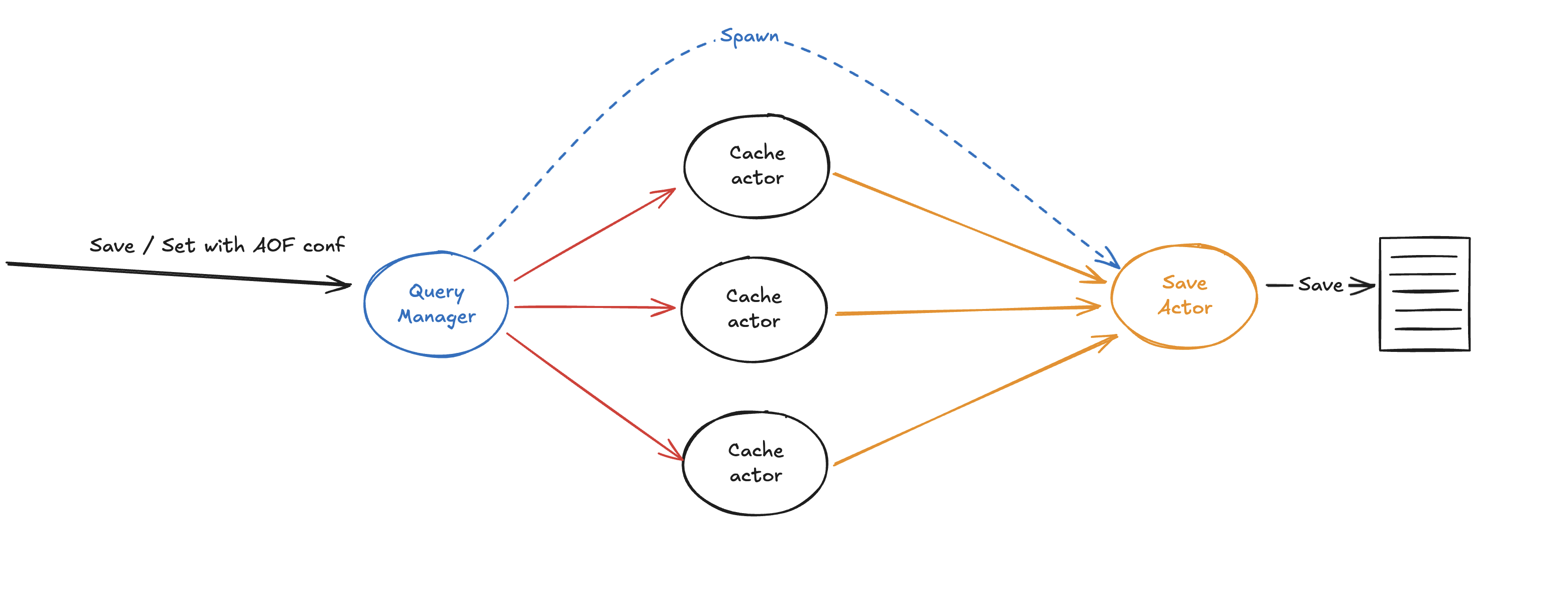In this design, Query manager(actor) spawns Save Actor when the save operation arrives, possibly with some other metadata such as number of cache actors.