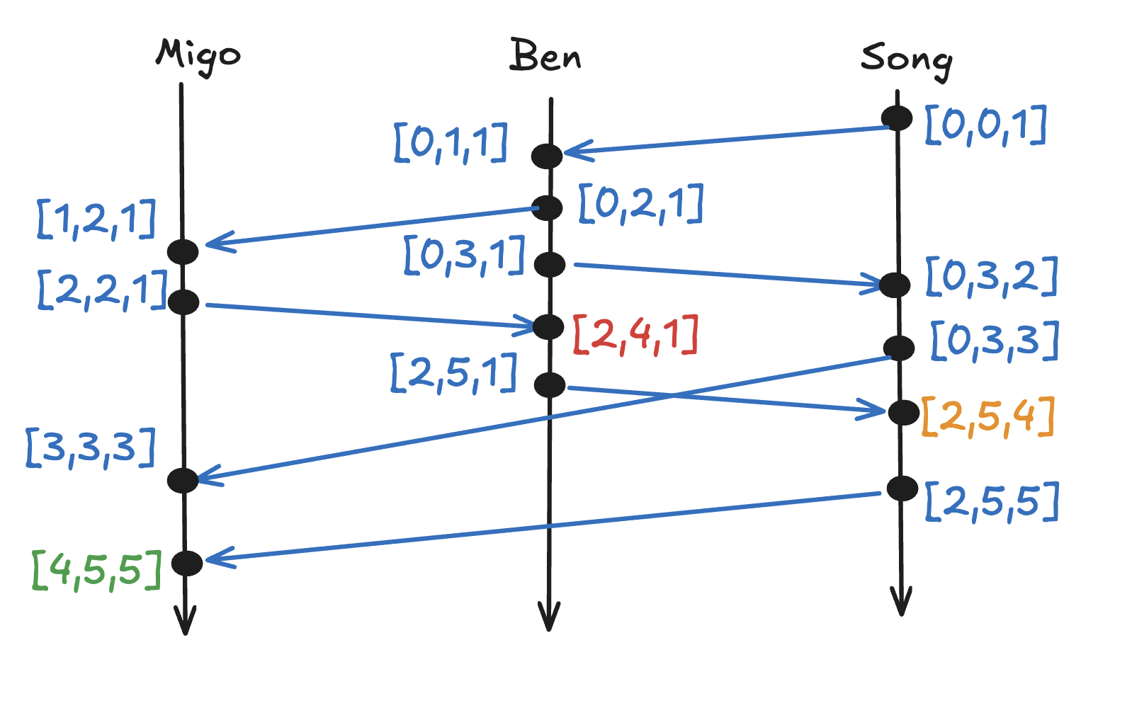 Here, let's take vector clock in red [2,4,1], for example. It has all the causal history of the following