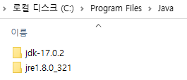 JDK와 JRE 설치파일을 순서대로 실행하면 해당 경로에 정상적으로 설치된 것을 확인할 수 있다.