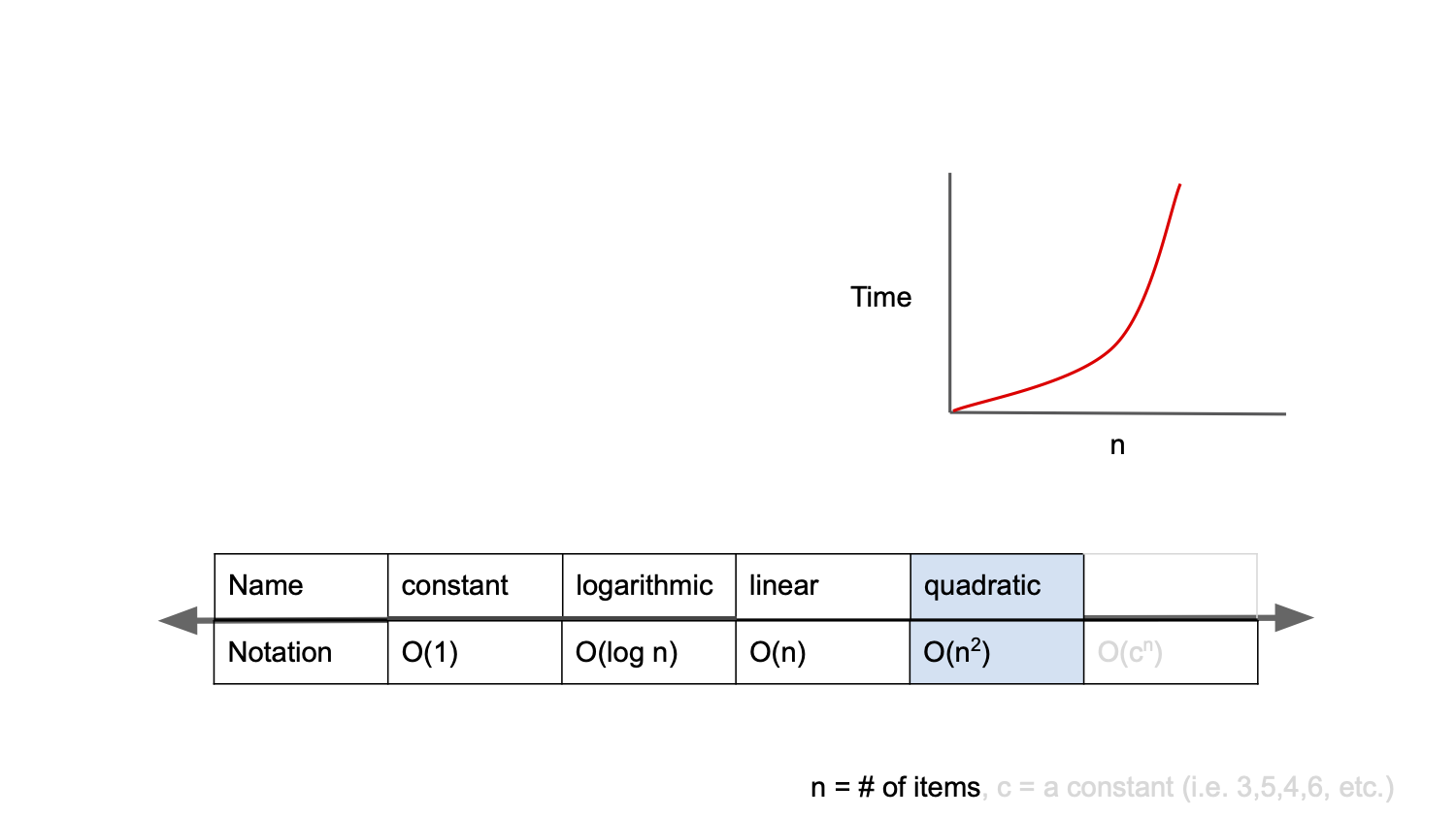 입력값이 증가함에 따라 시간이 그의 제곱수의 비율로 증가하는 것을 의미.