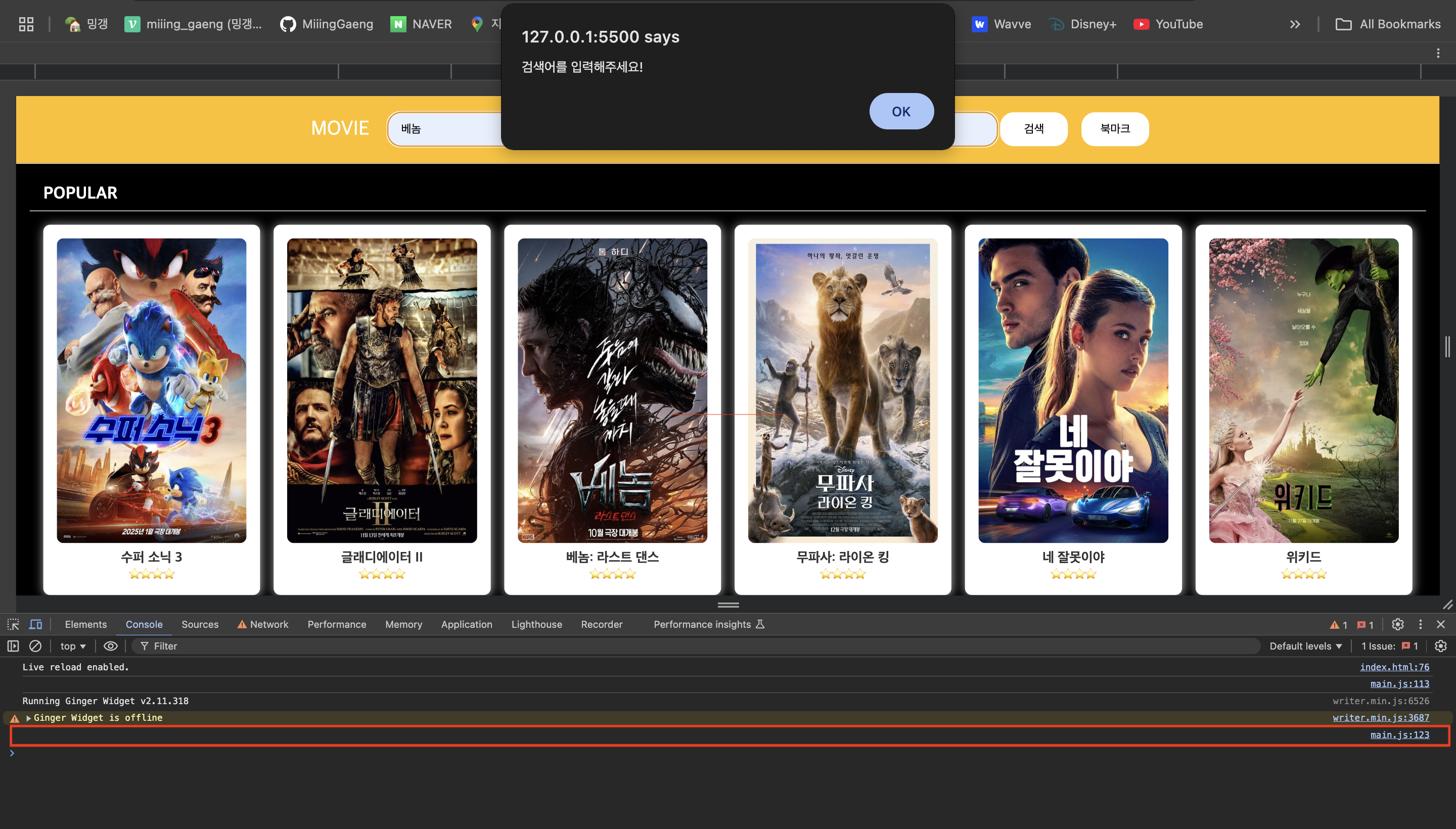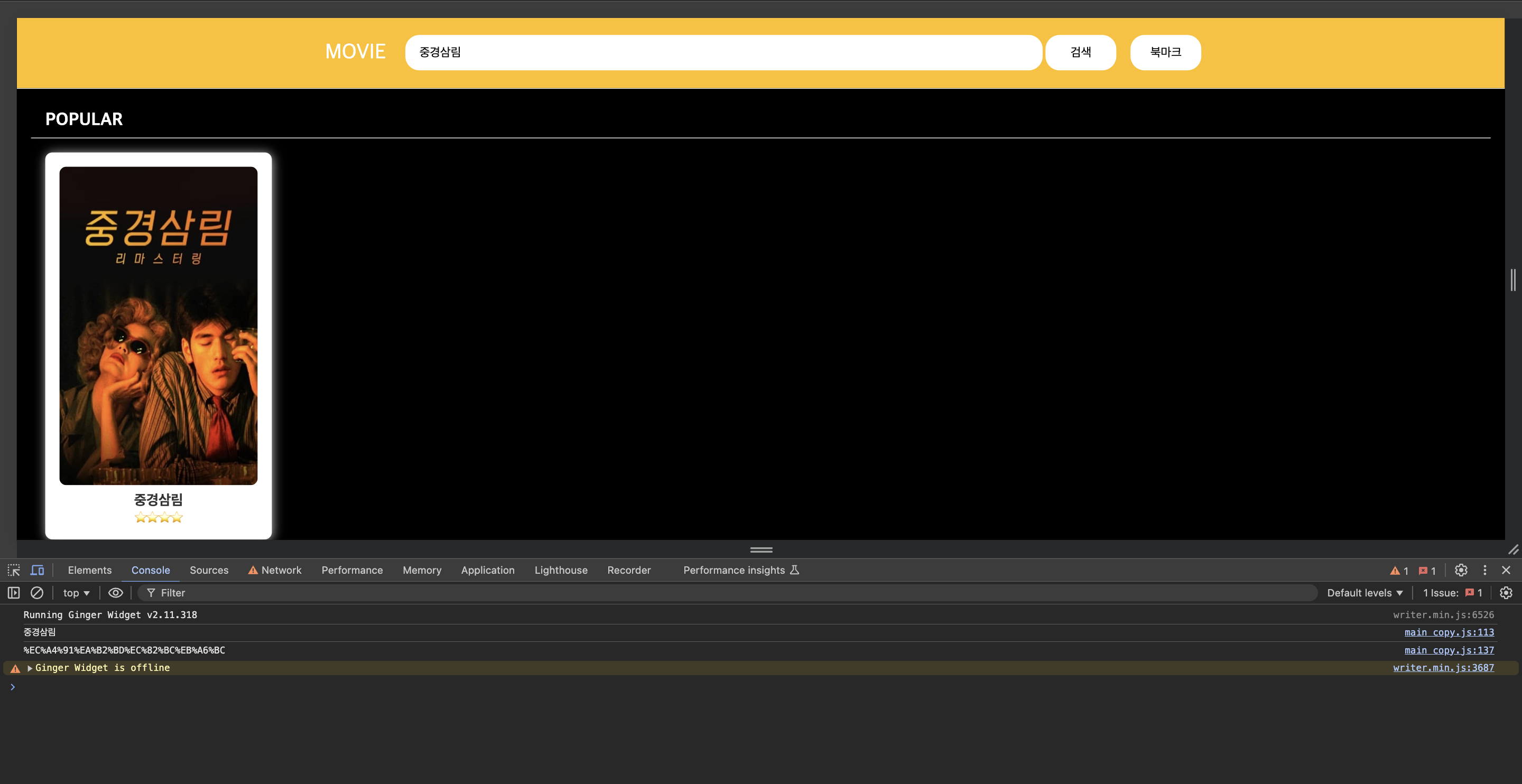 내가 가장 사랑하는 영화인 '중경삼림 '으로 다시 검색해보았다. console창에 input 값이 잘 찍히고, 오류 없이 깔끔한 것을 보니 코드가 제대로 수정된 것 같다.